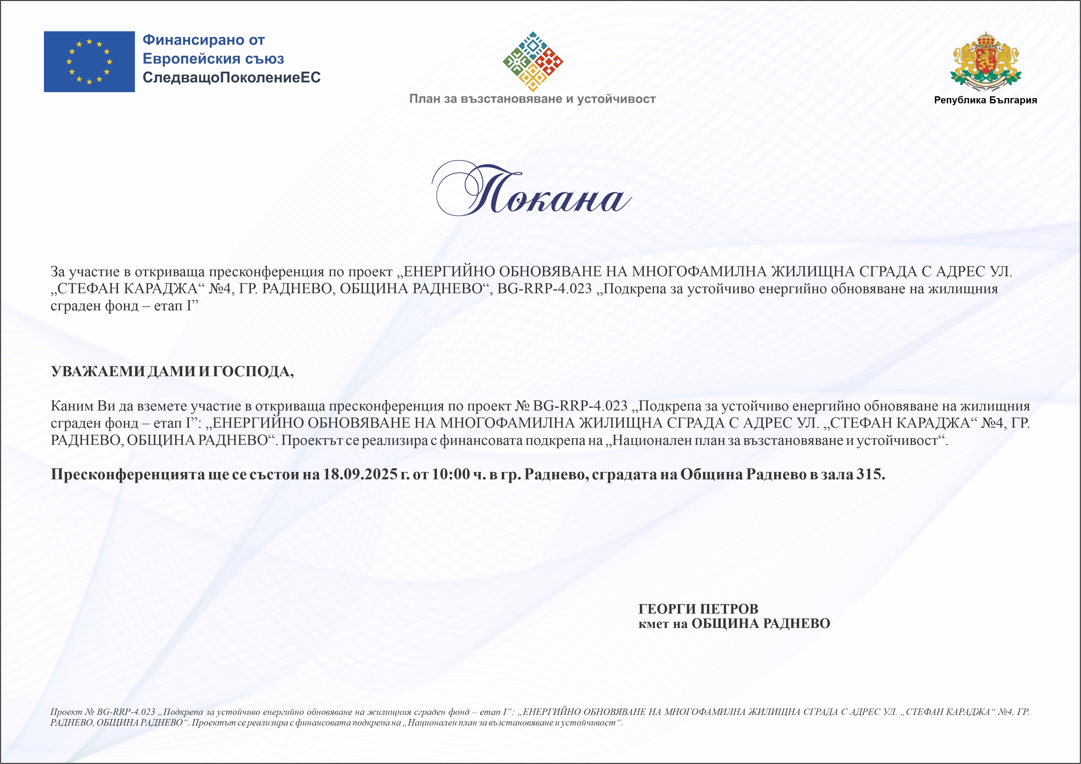 ПРОЦЕДУРА „ПОДКРЕПА ЗА УСТОЙЧИВО ЕНЕРГИЙНО ОБНОВЯВАНЕ НА ЖИЛИЩНИЯ СГРАДЕН ФОНД - EТАП I“, С ФИНАНСИРАНЕ ПО ЛИНИЯ НА МЕХАНИЗМА ЗА ВЪЗСТАНОВЯВАНЕ И УСТОЙЧИВОСТ